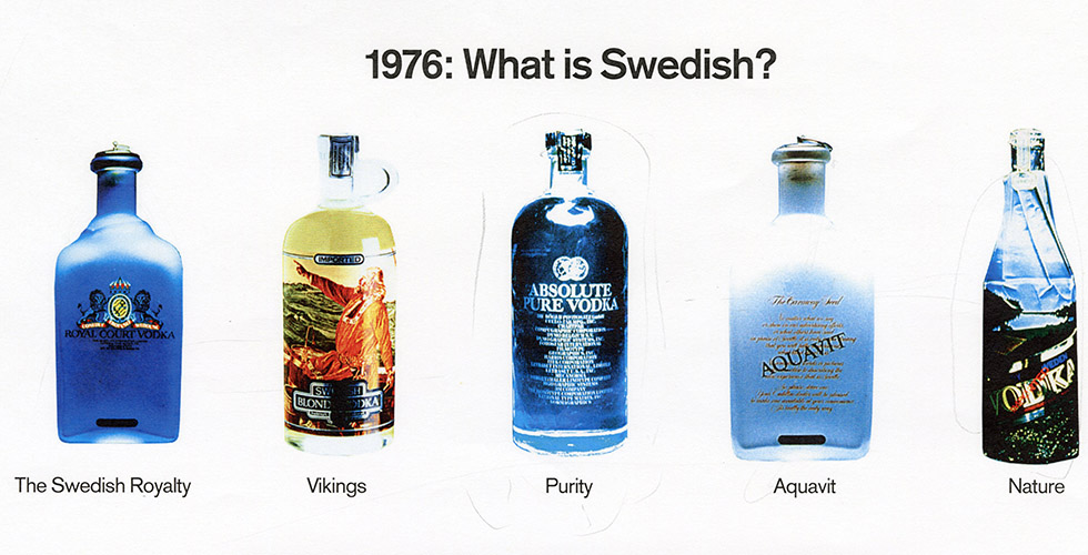 Några mindre justeringar gjordes längs vägen, som att man tog bort ordet pure och ett e från Absolute – en optisk illusion som gjorde kopplingen till Sverige starkare. Drygt 40 år senare är flaskan sig lik.