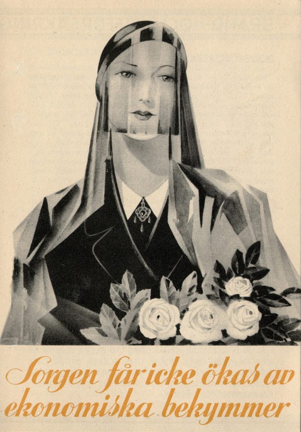 Begravnings- och dödsboförsäkring. Broschyr från Brand- och Lifförsäkringsaktiebolaget Skåne rörande begravnings- och dödsboförsäkring. "Sorgen får icke ökas av ekonomiska bekymmer. 1934". Skandias historiska arkiv hos Centrum för Näringslivshistoria.