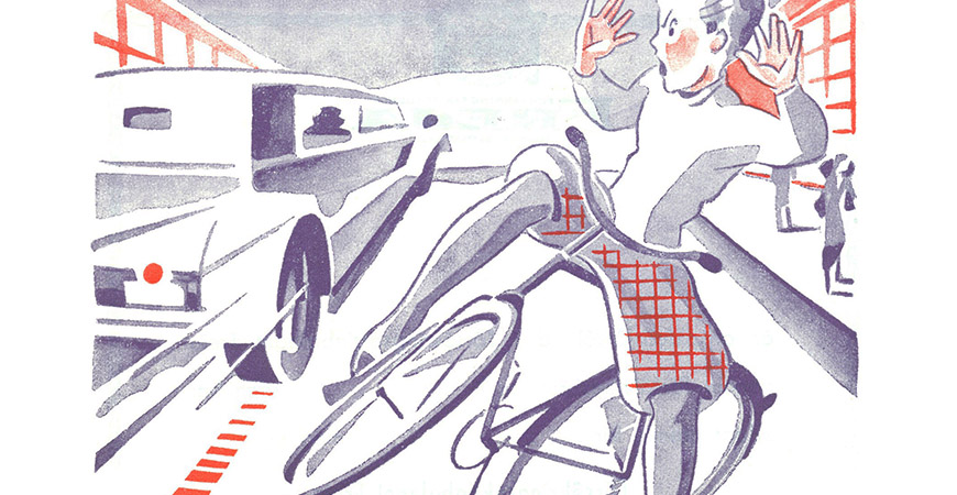 Bilden är en del av en broschyr i vilken försäkringsbolaget Skandia marknadsförde sin olycksfallsförsäkring 1931. Det man gör – i ett tidstypiskt maner – är att uppmana cyklisterna att ta det lugnt i trafiken;