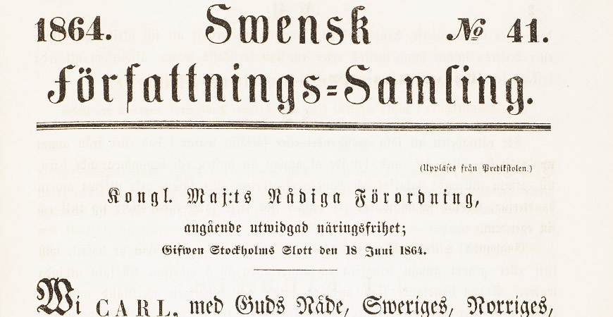 Jag syftar på den näringspolitiska revolution som ägde rum en lördag den 18 juni 1864 på slottet, under en konselj i närvaro av Kung Karl den femtonde. Då undertecknades förordningen om utvidgad näringsfrihet som bestämde att »enhvar svensk man och kvinna fick starta och driva företag uti konungariket Sverige«.