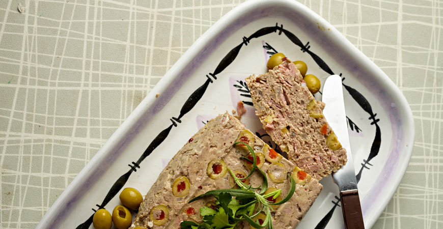 Beredning: Finhacka lök och vitlök. Blanda samman i en skål köttfärs, lök, kryddor, salt och mjöl. Vispa samman äggen med crème fraiche och rör ner färsen. Arbeta till en smidig färssmet. Skär skinkan i strimlor och skiva oliverna. Täck bottnen på en avlång form med rundade hörn med olivskivorna. Häll på 1/3 av färsen, strö över hälften av skinkan, sedan färs, resten av skinkan och överst färs. Jämna till och täck med t ex mikrofilm. Tillaga på full effekt 10–12 min. Låt patén kallna i formen. Stjälp upp den och garnera med rosépeppar och en kvist grönt.